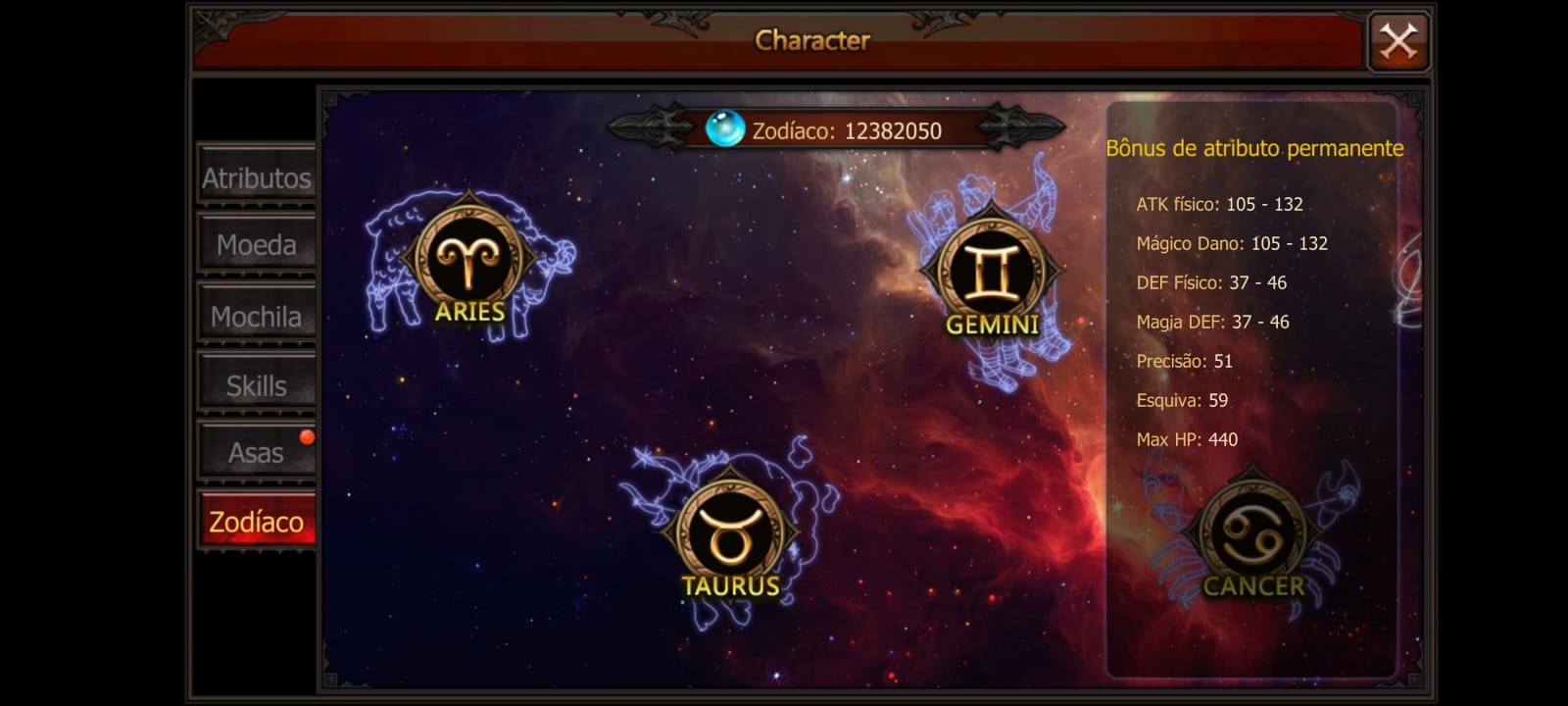 O Zodiaco é um sistema de upgrade para o personagem, você usa star essence, e a cada vez que você faz o upgrade, O combat power aumenta, Pode acontecer de o processo de upgrade falhar, e você perder star essence com isso, quando finaliza um signo do zodiaco, Seus atributos Gerais são aumentados.