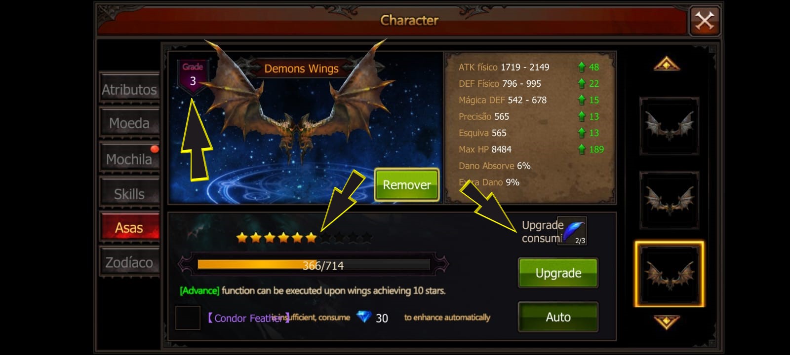 Você precisa de condor feather para aumentar as estrelas, quando sua asa tiver o maximo de estrelas, Você precisará de condor flame para evoluir o grau da sua asa, e com isso a sua asa vai se tranformar em uma versão melhorada.