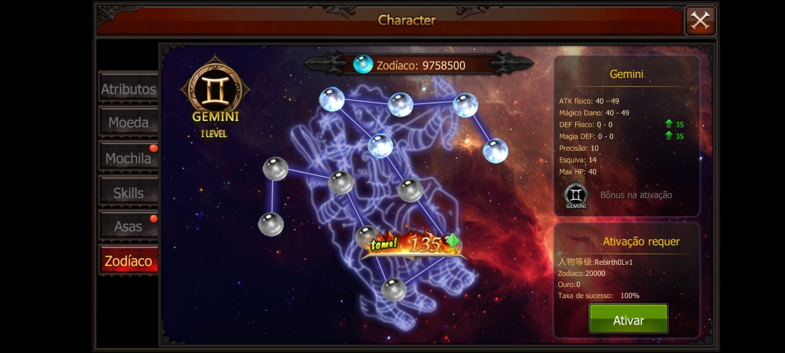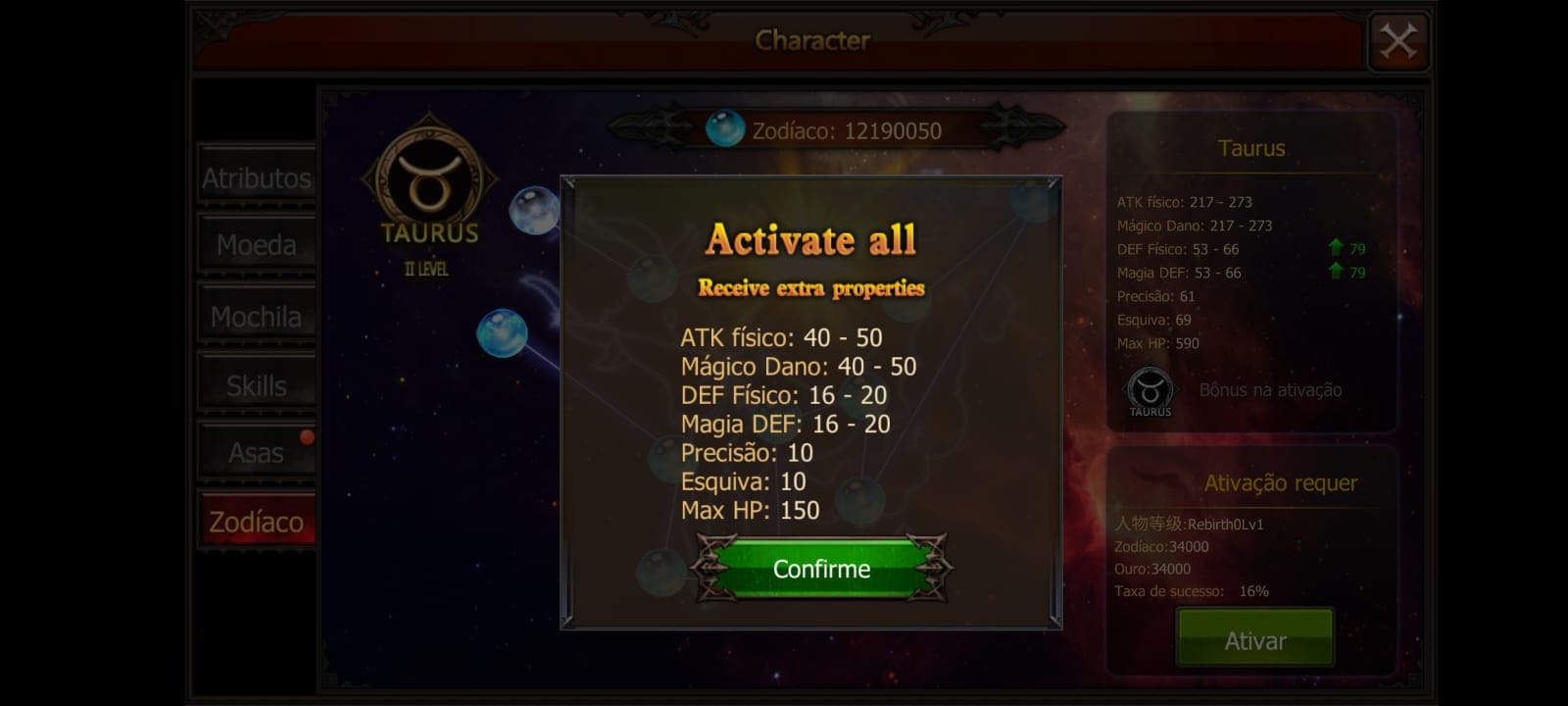 O Zodiaco é um sistema de upgrade para o personagem, você usa star essence, e a cada vez que você faz o upgrade, O combat power aumenta, Pode acontecer de o processo de upgrade falhar, e você perder star essence com isso, quando finaliza um signo do zodiaco, Seus atributos Gerais são aumentados.